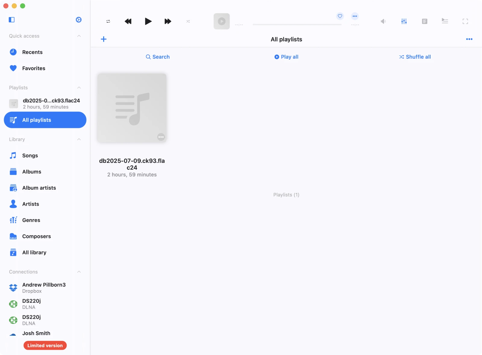 Tryk på afspilningslisten for at se alle spor og starte afspilning.