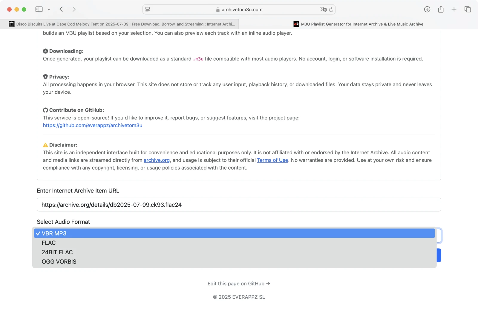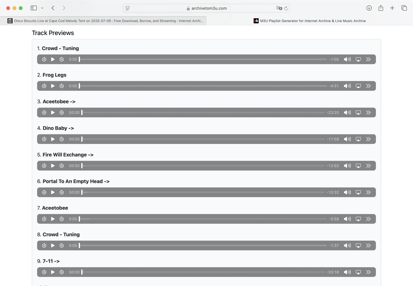 Værktøjet bruger den officielle Internet Archive Metadata API til at hente sporlister og generere afspilningslistefiler. Ingen medier hostes eller spejles af webstedet. Du kan også forhåndsvise spor direkte i din browser ved hjælp af den indbyggede afspiller.