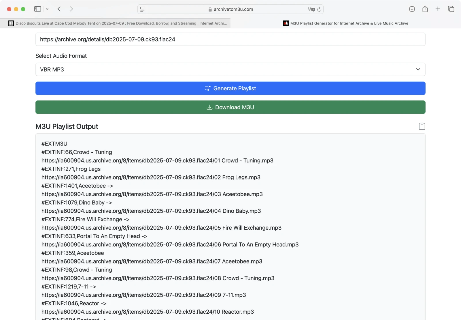 Dette gratis værktøj giver dig mulighed for at indsætte en hvilken som helst Internet Archive element-URL og øjeblikkeligt generere en afspilbar .m3u-fil — ingen tilmelding eller softwareinstallation påkrævet.
