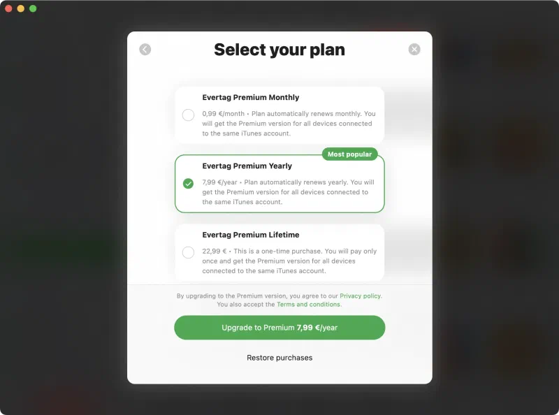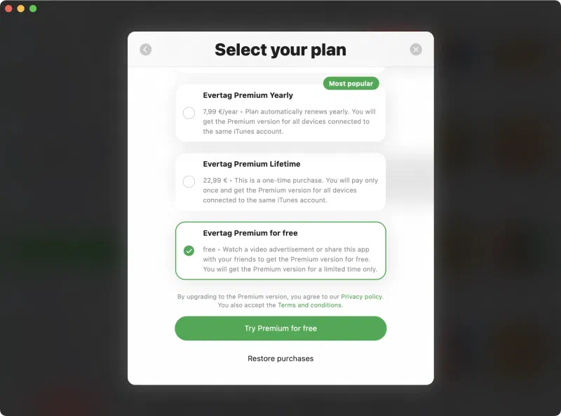 You can also try pressing the “Restore Purchases” button in the app Settings. Afterward, install the latest app version from the App Store on your Mac and start the app. Ensure you have an internet connection and are using the same iCloud and App Store account on your Mac that you used on your iOS device. Wait one minute for the app to download purchase info from iCloud. The Premium version should activate on your Mac automatically.