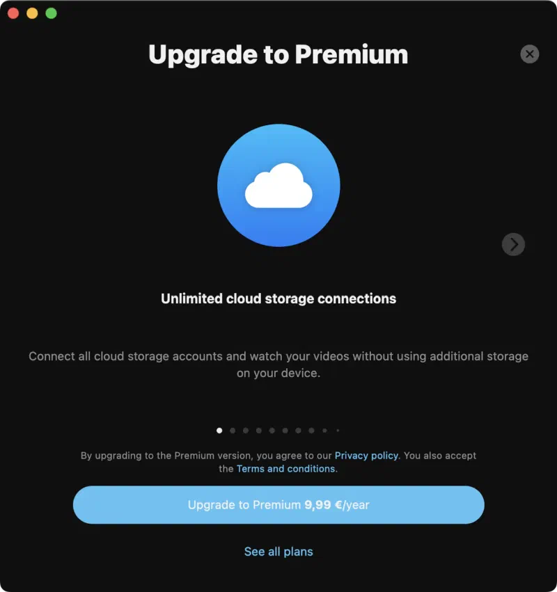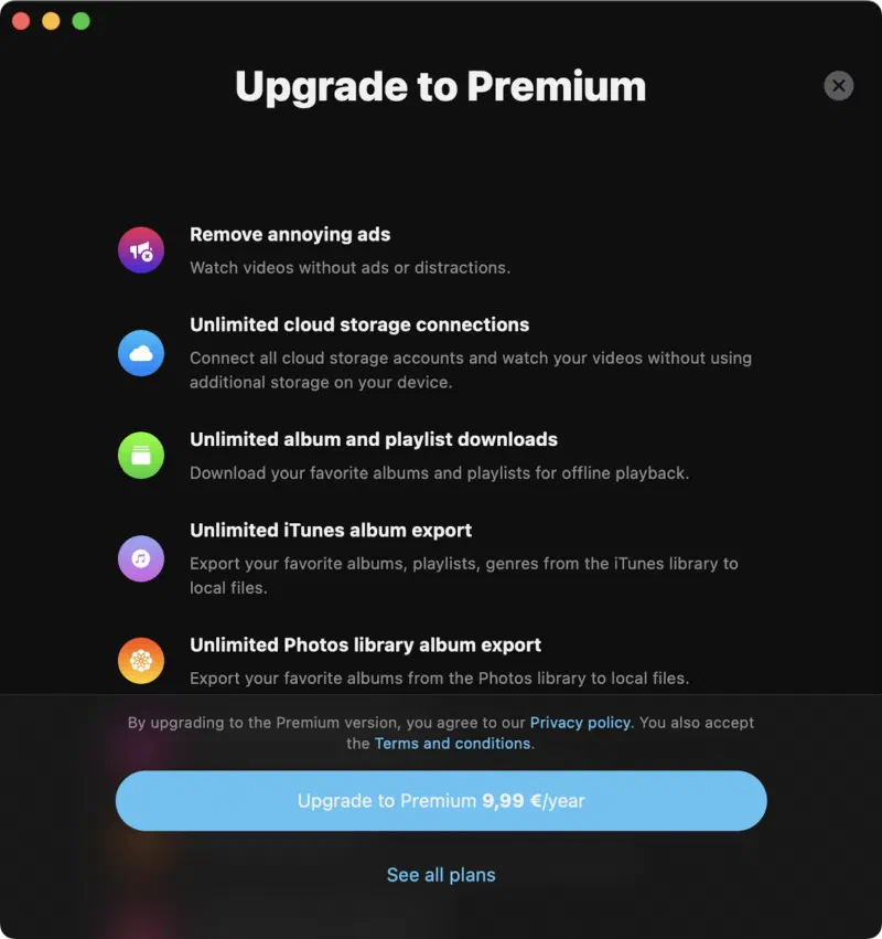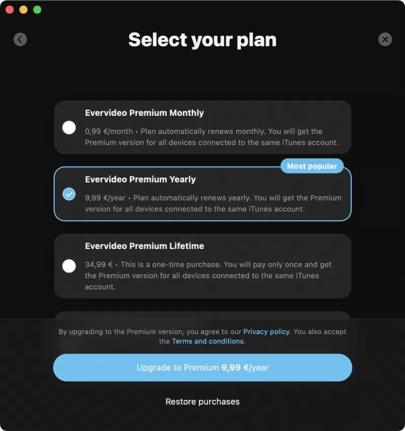 On the other hand, Evervideo Premium unlocks the full experience. You’ll enjoy an ad-free interface, unlimited playlist and queue support, full offline functionality, cloud flexibility, and advanced exporting and personalization options. It’s the best option for users with large video libraries, those who watch content from multiple sources, or anyone looking for a more professional and seamless media player.