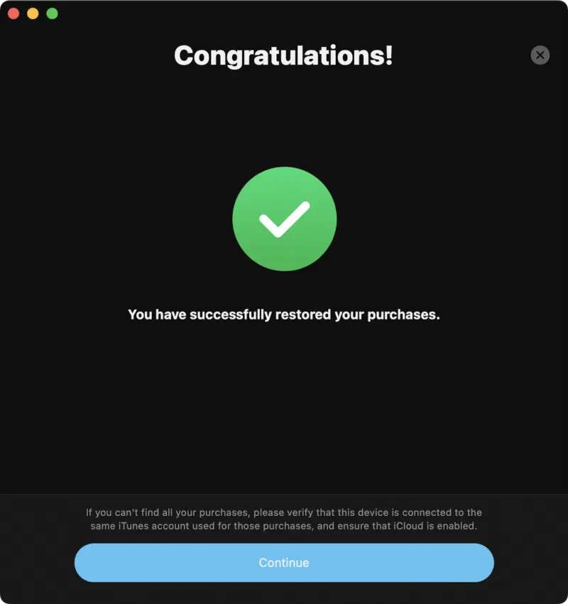 You can also try pressing the “Restore Purchases” button in the app settings. Afterward, install the latest app version from the App Store on your Mac and start the app. Ensure you have an internet connection and are using the same iCloud and App Store account on your Mac that you used on your iOS device. Wait one minute for the app to download purchase info from iCloud. The premium version should activate on your Mac automatically.