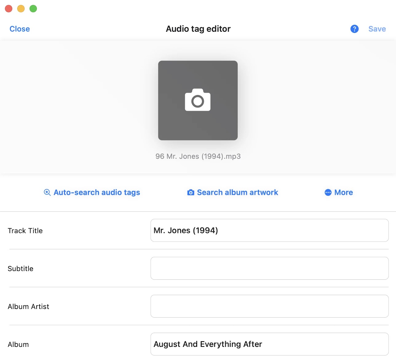 You can also utilize the smart autocomplete feature by tapping the ‘Auto-Search Audio Tags’ button. This helps correct spelling errors and adds missing information. Imagine you only remember the artist and track name but not the album name – simply fill in the known fields (mistakes are allowed) and tap the ‘Auto-Search Audio Tags’ button. The app will use an online database to find missing tags for your track and fill in the gaps.